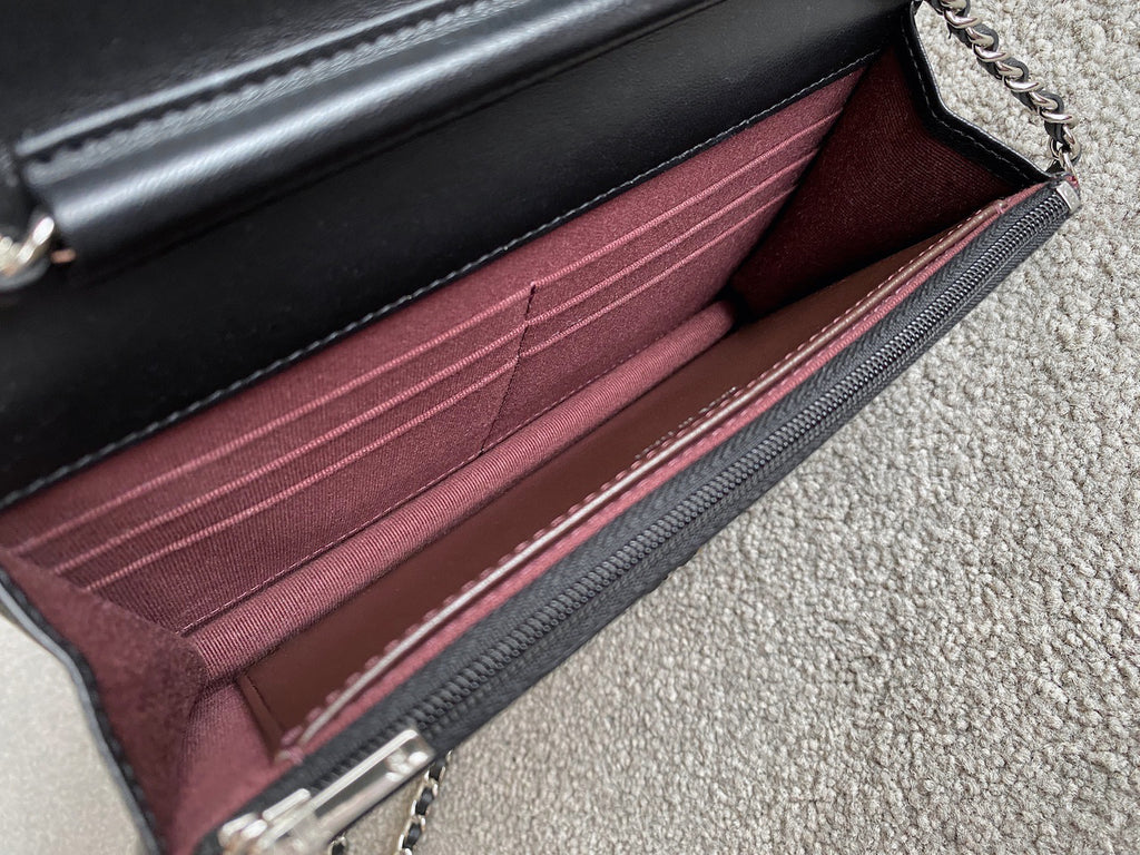 This Chanel Classic comes up so rarely on the preloved market here. Perfect for day or evening - and with the chain strap able to be doubled over, worn cross-body at full length or tucked inside to allow this beauty to be carried as a clutch, also wonderfully versatile. Black quilted lambskin leather is highlighted by polished silver-tone hardware and detailed with signature burgundy interior. Gorgeous, chic and beautifully finished, this is exquisite: Chanel at its finest.